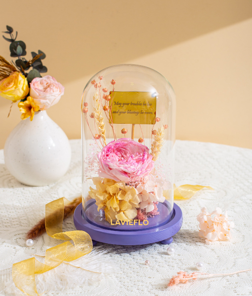 The lively play of colours in these preserved flowers encased in a bell jar makes for a lovely surprise! Add on a personalised message engraved on a gold plate to your gift that much more unique!
