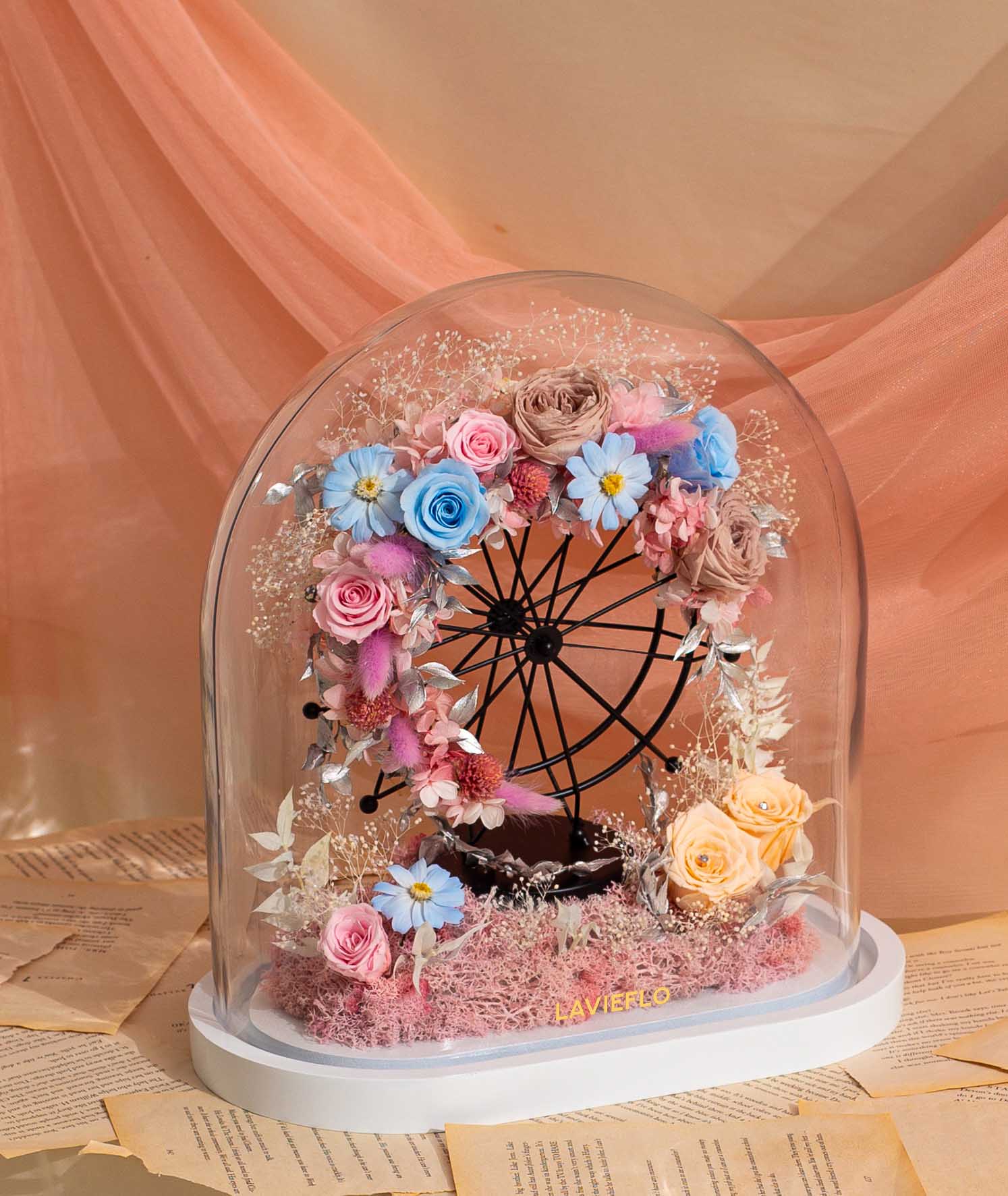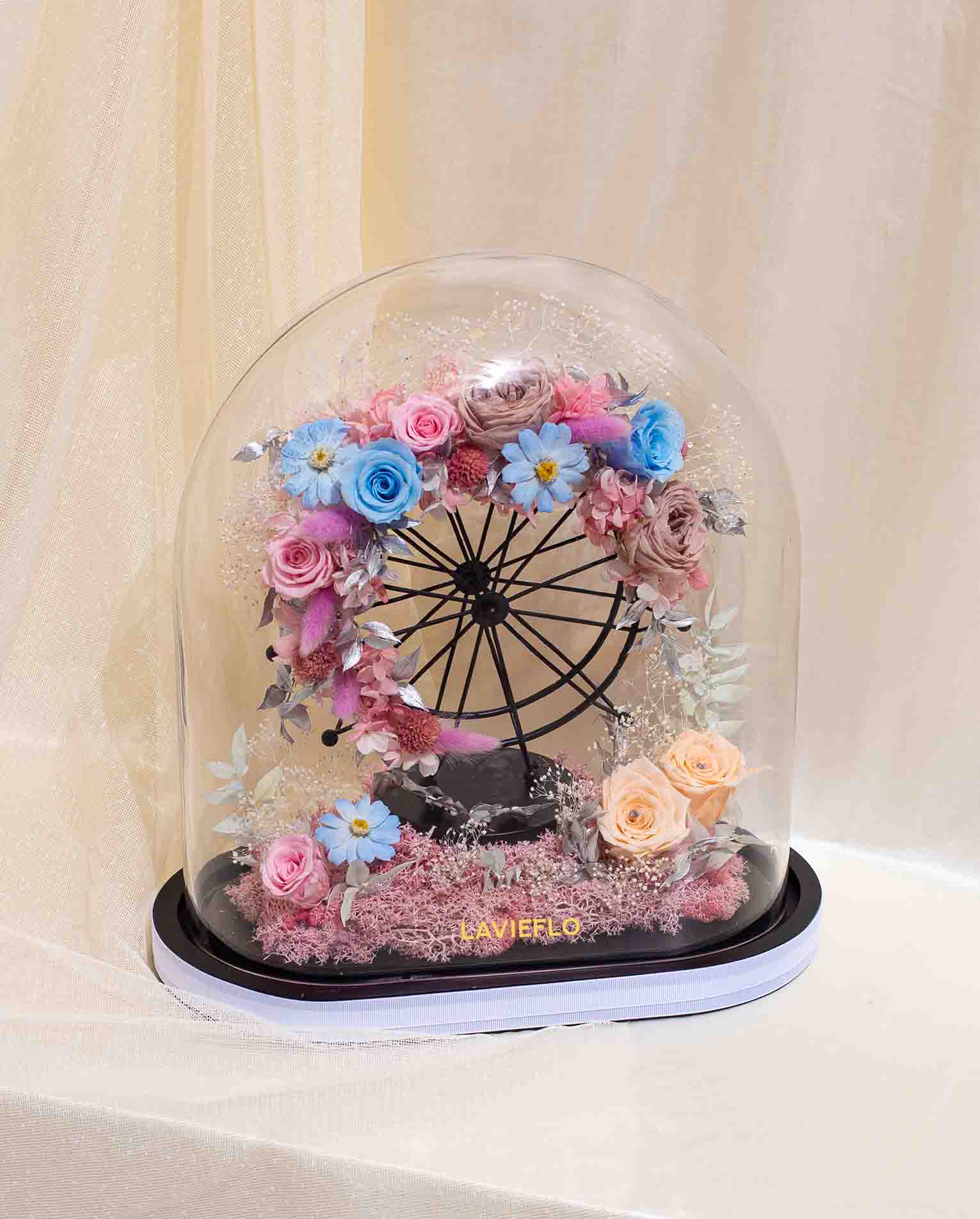 A gift grand enough to impress the one you love…Perfect for romantic moments, the Ferris Wheel reminds us to hold on to each other through ups and downs. Watch this arrangement come alive with fairy lights – like seeing a Ferris Wheel light up against the night sky. A magical gift to represent your love this Valentine’s day.