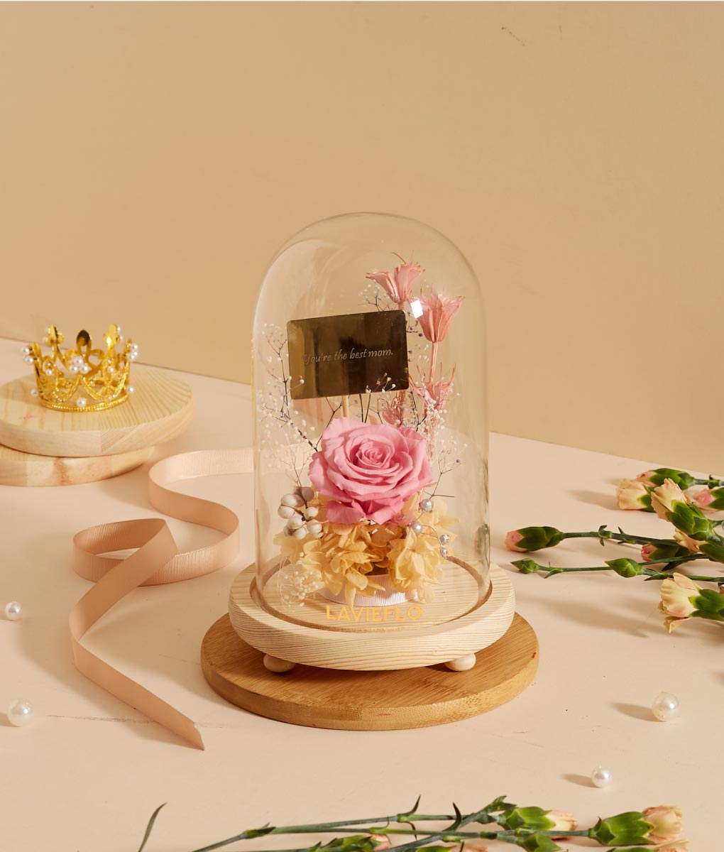 What’s a Queen without her crown and what’s a special occasion without flowers? Make her feel absolutely special with this unique gift of preserved flowers with a crown ornament! Engrave a name or some heartfelt wordings on a gold plate to make your gift truly special!